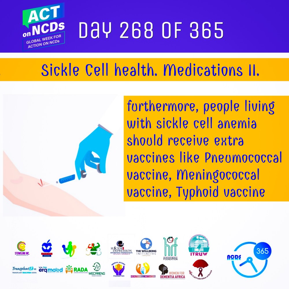 • Vaccinations – People living with sickle cell anemia have a normal anti-body response to vaccines and should receive all immunizations, recommended , furthermore, people living with sickle cell anemia should receive extra vaccines like Pneumococcal vaccine, Meningococcal vaccine, Typhoid vaccine and any that may be recommended by the doctor depending on the situation.