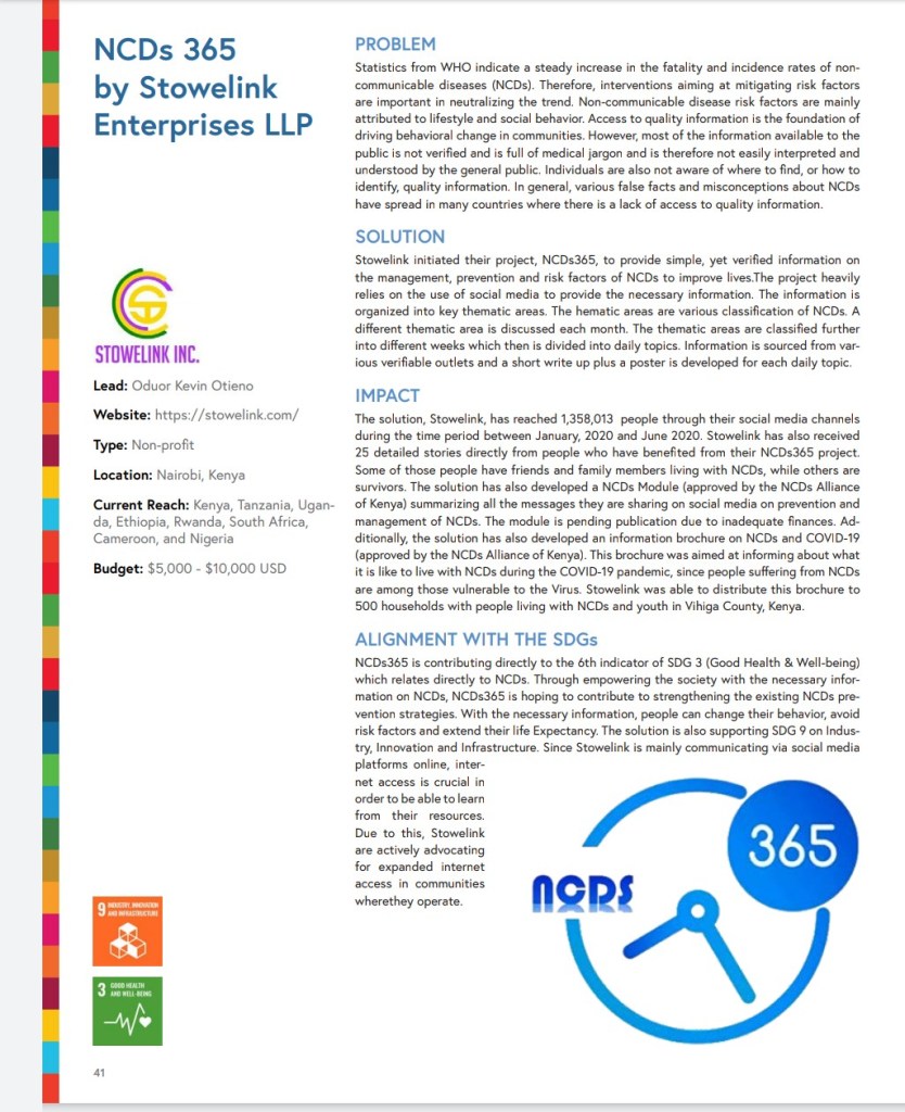 Another big win for Stowelink in 2020. Stowelink’s NCDs 365 was published in the UNSDSN 2020 report as one of the top 50 most innovative projects for sustainable development globally. The project began on 1st January, 2020 and has its phase one ending on 31st December, 2020. NCDs 365 collects verifiable information on NCDs and disseminates this information on daily social media posts. The project has so far reached more than one million individuals online and 500 household’s offline. Even as the project moves to the next phase, Stowelink is committed to continue transforming live through creating innovative and high impact projects.