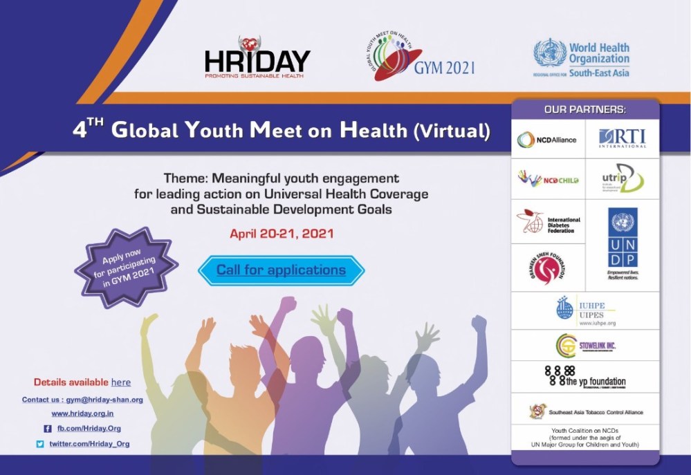 HRIDAY hosted the First GYM in 2006 with an aim to unify efforts from different sectors and organizations for youth inclusion on various health themes. The successful outcome of the conclave paved the way for the Second GYM in 2009, which was held as a pre-conference workshop to the 14th World Conference on Tobacco OR Health (WCTOH) at Mumbai, India to deliberate and debate on tobacco control issues. The Third GYM 2015 laid emphasis on empowering youth with advocacy and leadership skills to develop action plan for reaching the Post 2015 Goals and called attention from various sectors nationally and internationally to invest in youth for sustainable future through the ‘GUARD OUR GLOBE’ movement. HRIDAY is now organizing the 4th GYM on Health (Virtual) in April, 2021. The proposed theme is “Youth-led innovative public health actions for Universal Health Coverage and Sustainable Development Goals”. GYM 2021 will strengthen the capacity of youth leaders, hone their skills to plan, implement, monitor and scale-up integrated campaigns to meet their national NCD targets and accelerate action for SDGs.