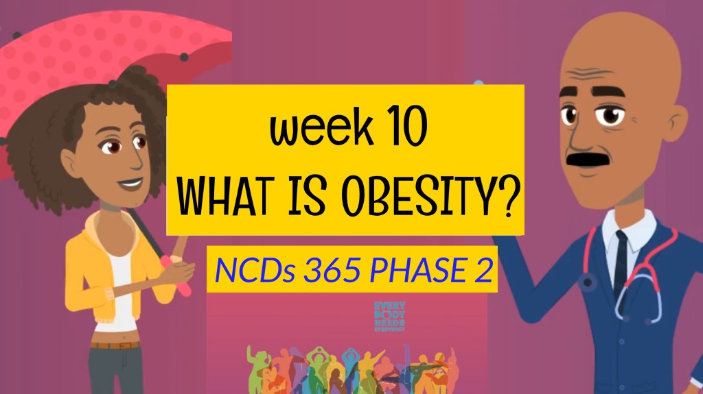 Week ten of the NCDS 365 Phase Two consisted of sharing information of what Obesity is. Obesity was described as a complex disease involving an excessive amount of body fat. It is diagnosed when your Body Mass Index (BMI) is 30 or higher. Having Obesity increases your risk of other diseases and health problems such as Heart failure, diabetes, high blood pressure and certain cancers. Obesity is said to arise from a combination of inherited factors combined with the environment, personal diet and level of physical activity. With appropriate management of weight, diet and proper physical activity, Obesity can easily be managed.