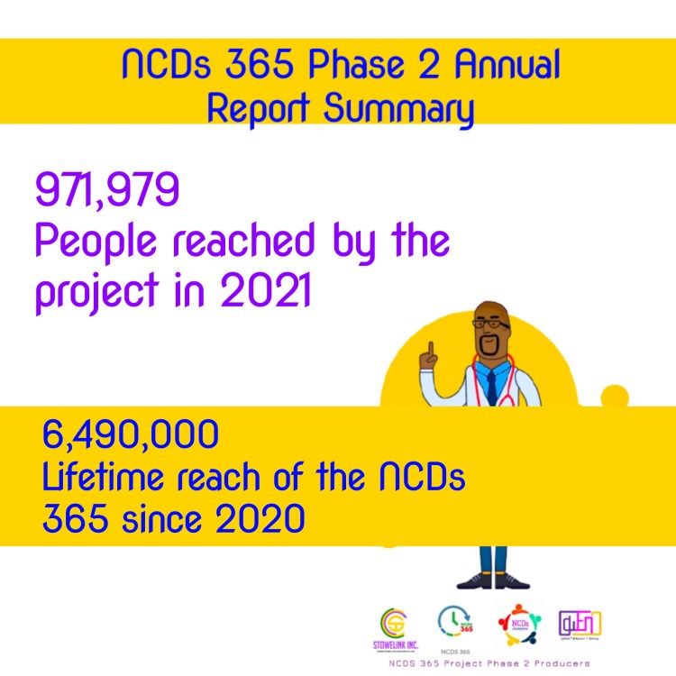 NCDs project was conducted in two phases. In 2020, daily messages covering the major NCDs were shared across all the social media platform. Working with the team at Stowelink, we were able to develop 365 messages around the major NCDs. These messages were well researched and thoroughly reviewed by the team. In 2021, which marked the second phase, the project focused on producing animated videos on NCDs which were posted weakly on YouTube throughout the year. The project is ongoing and, in this year, (2022), we have started doing NCDs lived experience stories to give hope to people living with NCDs. Identified persons living with NCDs are interviewed and their journey with NCDs and story of hope shared with NCDs community and the general population.