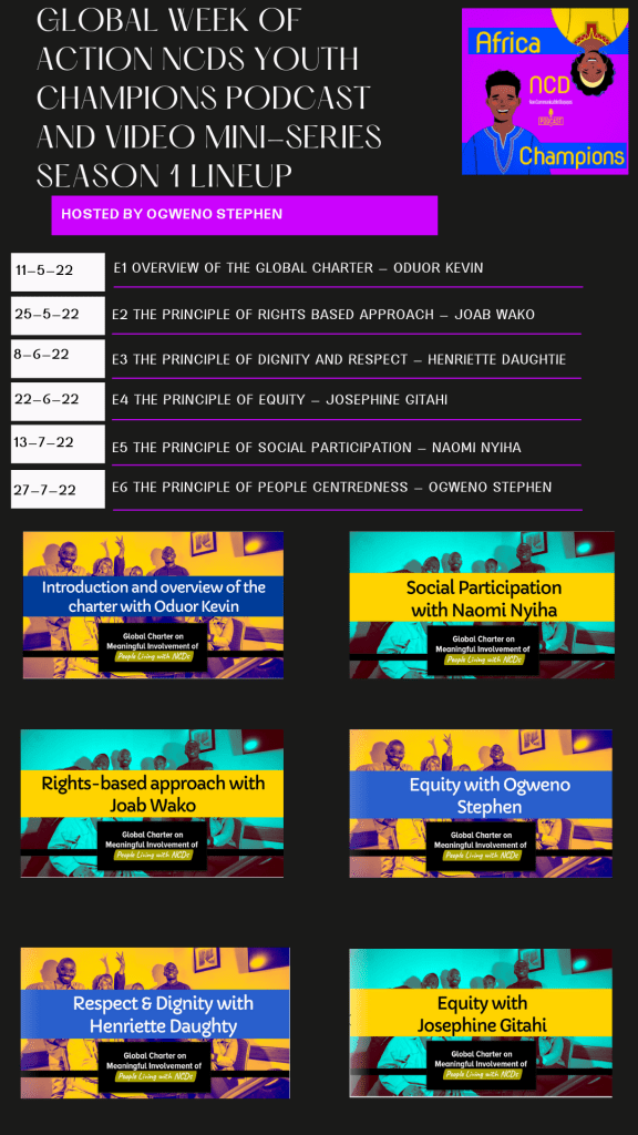 Stowelink recently partnered with the NCD Alliance Of Kenya and the NCDs patient group caucus to develop and distribute a dissemination of the global week of charter for meaningful involvement for people living with NCDs. This was done through a mini audio-visual podcast series that’s can now be accessed and watched across the world through listening in on podcast and YouTube platforms. This was an excellent way to disseminate and endorse the charter by involving young people to run the campaign as a result leverage on their platforms and reach them there with this information and opportunity.