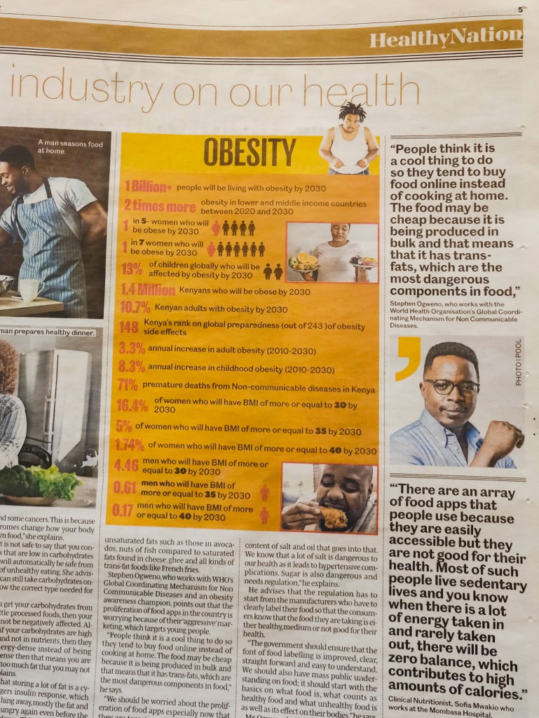 Stowelink CEO Ogweno Stephen was recently featured in a two-pager article on The Daily Nation Newspaper addressing the conversation on obesity in Kenya and the role that food applications and targeted advertising play. In the news article Ogweno addresses the critical question on the effect of these food apps but more than that he also offers practical suggestions and recommendations to solutions both at a policy level and implementation level to ensure better quality of food and a reduction in obesity attributed to food apps.